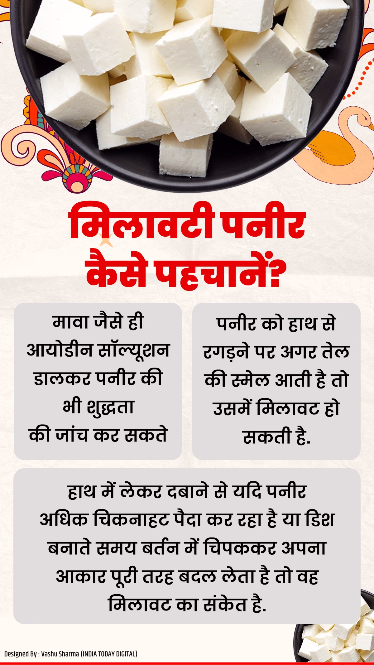 'Raw paneer is rarely eaten, but its taste can signal adulteration. Tongue bitterness and an iodine solution can verify purity.'