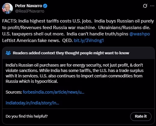Following the fact-check by X, Navarro, closely tied to Trump, lashed out at Elon Musk, writing, "Wow! Elon Musk is spreading propaganda in people's posts. The cheap note below is evidence of that. Deplorable. India buys oil from Russia solely for profit. It bought no oil from Russia before the invasion of Ukraine. The Indian government's spin machine is operating at full throttle. Stop killing Ukrainians. Stop stealing American jobs."