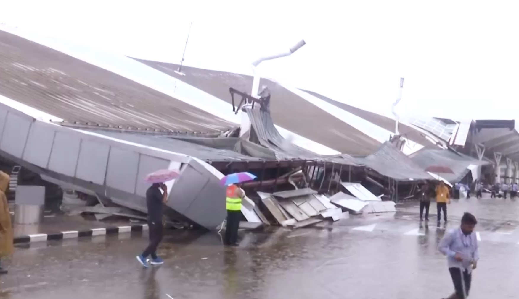In the early hours amid heavy rainfall, a line of vehicles at Terminal 1 was disrupted by the sudden collapse of the parking roof, causing chaos and prompt calls for emergency services.