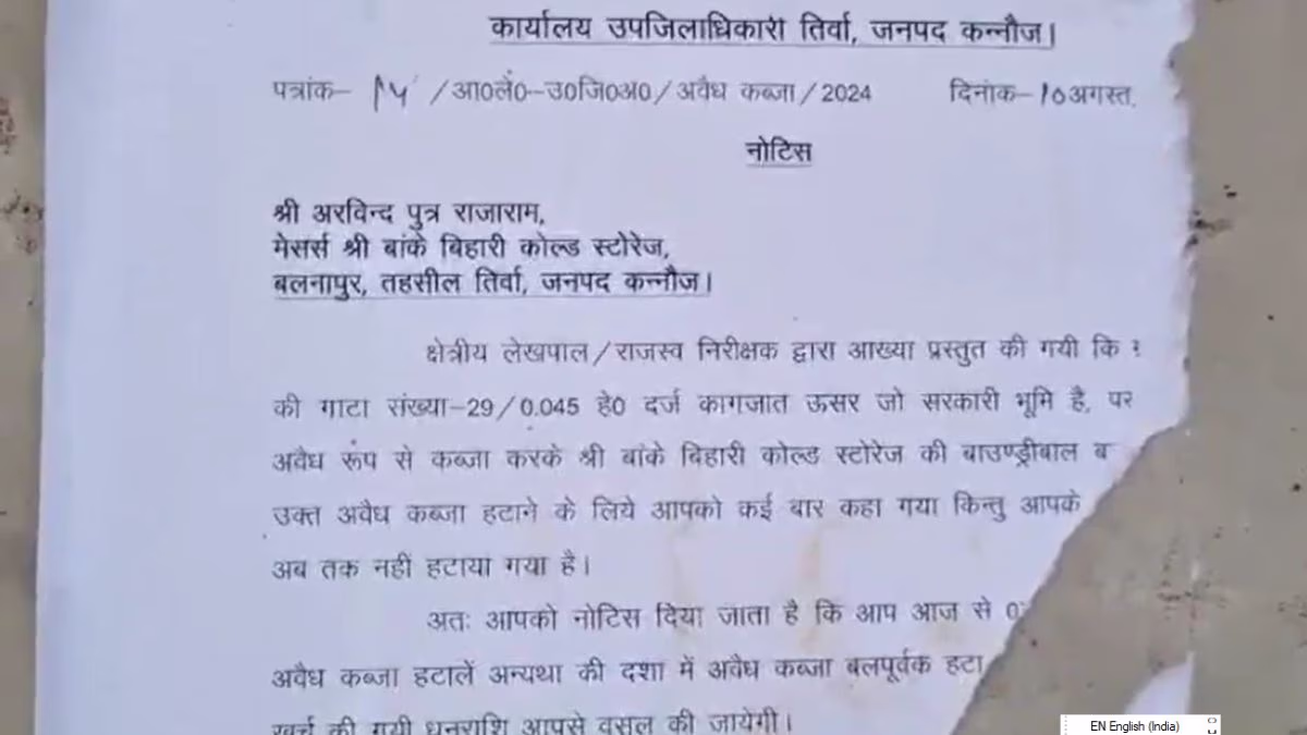 The troubles continue to mount for the relatives of Nawab Singh Yadav, the former block chief who is currently imprisoned in Kannauj, UP, for a case of minor rape. The administration of Tirva Tehsil has issued a notice regarding a segment of cold storage built on community land, giving a one-week warning to vacate, with the threat of forcible eviction.