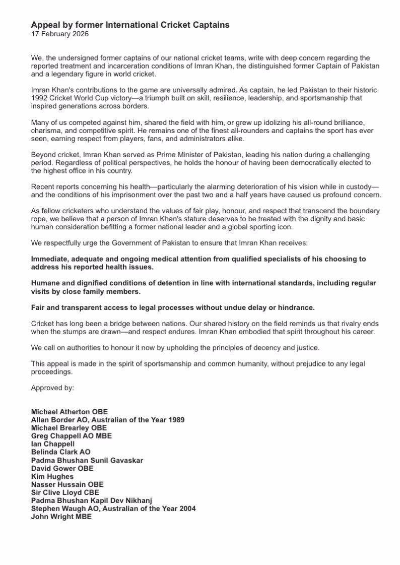 The former captains expressed concern over the reports of Imran Khan's health problems, particularly significant impairment to his right eye's vision. They have demanded immediate and regular medical attention from qualified specialists, adequate detention conditions meeting international standards, and permission for family visits.
