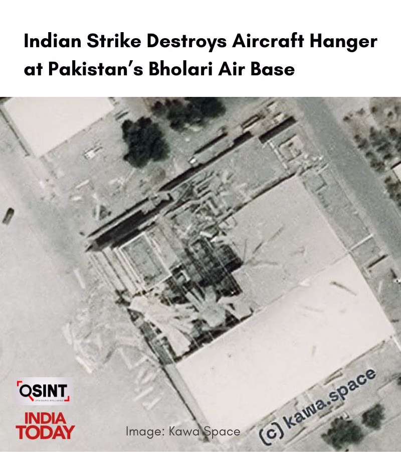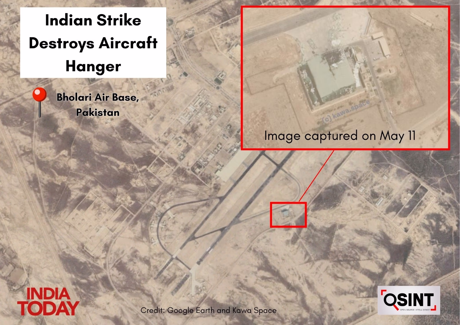 High-resolution imagery depicts a direct hit on a hangar at Pakistan Air Force's Bholari Airbase. Debris and structural damage are evident, with the proximity to the runway suggesting the targeted hangar's crucial role in reaction alerts.