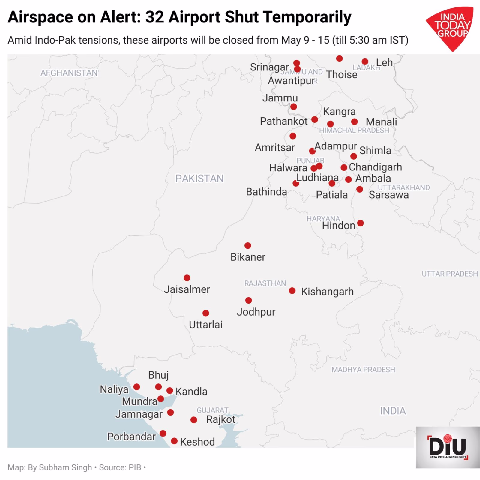 Major airports in Punjab such as Amritsar, Ludhiana, Patiala, Bathinda, Halwara, and Pathankot will remain closed. Himachal Pradesh's Bhuntar, Shimla, Kangra-Gaggal airports will also be shut down, alongside the Union Territory's Chandigarh airport. Airports in Jammu and Kashmir and Ladakh including Srinagar, Jammu, Leh, along with Rajasthan's Kishangarh, Jaisalmer, Jodhpur, Bikaner, and Gujarat's Mundra, Jamnagar, Hirasar, Porbandar, Keshod, Kandla, Bhuj airports will remain closed.