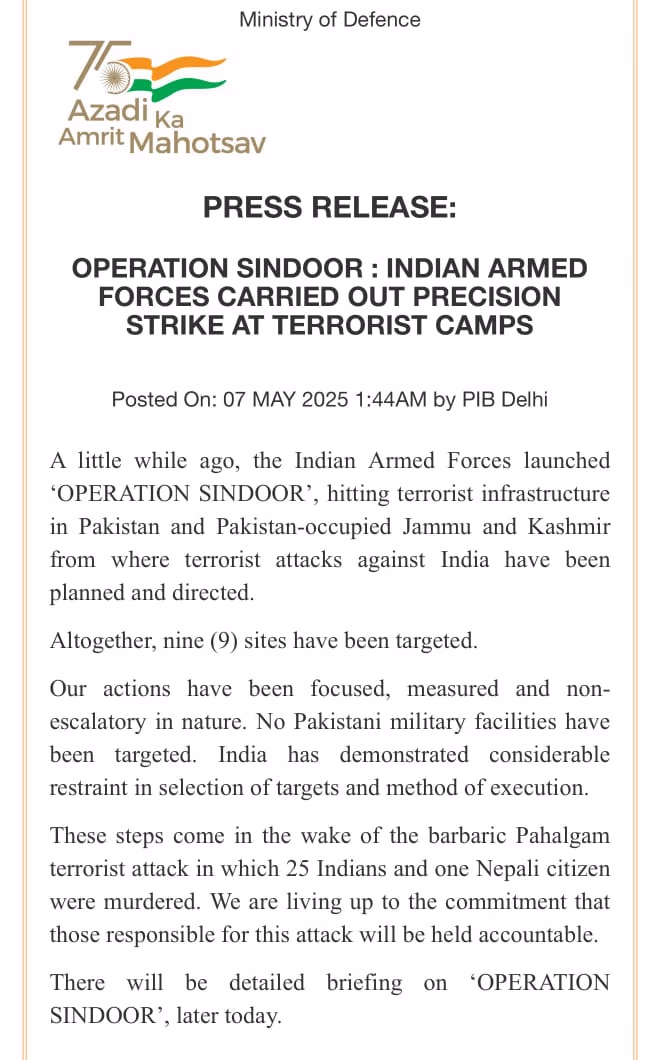 According to the Ministry of Defense, 'A short while ago, the Indian Armed Forces initiated 'Operation Sindoor,' targeting terrorist structures in Pakistan and Pakistan-occupied Jammu and Kashmir, where plans for terrorist attacks against India were hatched and executed.'