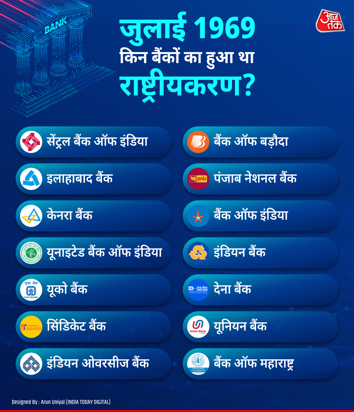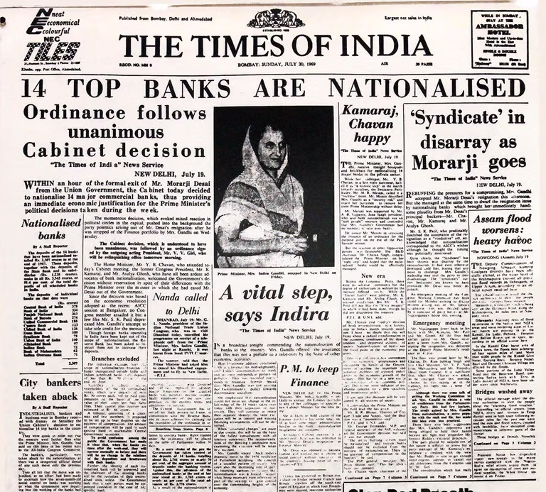 In July 1969, her government nationalized banks like Allahabad Bank, Canara Bank, United Bank of India, UCO Bank, Syndicate Bank, Indian Overseas Bank, Bank of Baroda, Punjab National Bank, Bank of India, Bank of Maharashtra, Central Bank of India, Indian Bank, Dena Bank, and Union Bank of India.