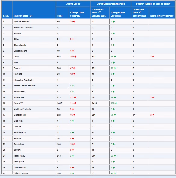 Currently, Kerala remains the most affected state with 1,487 active cases. Following Kerala, Delhi has reported 562 active cases, and Maharashtra has 526.