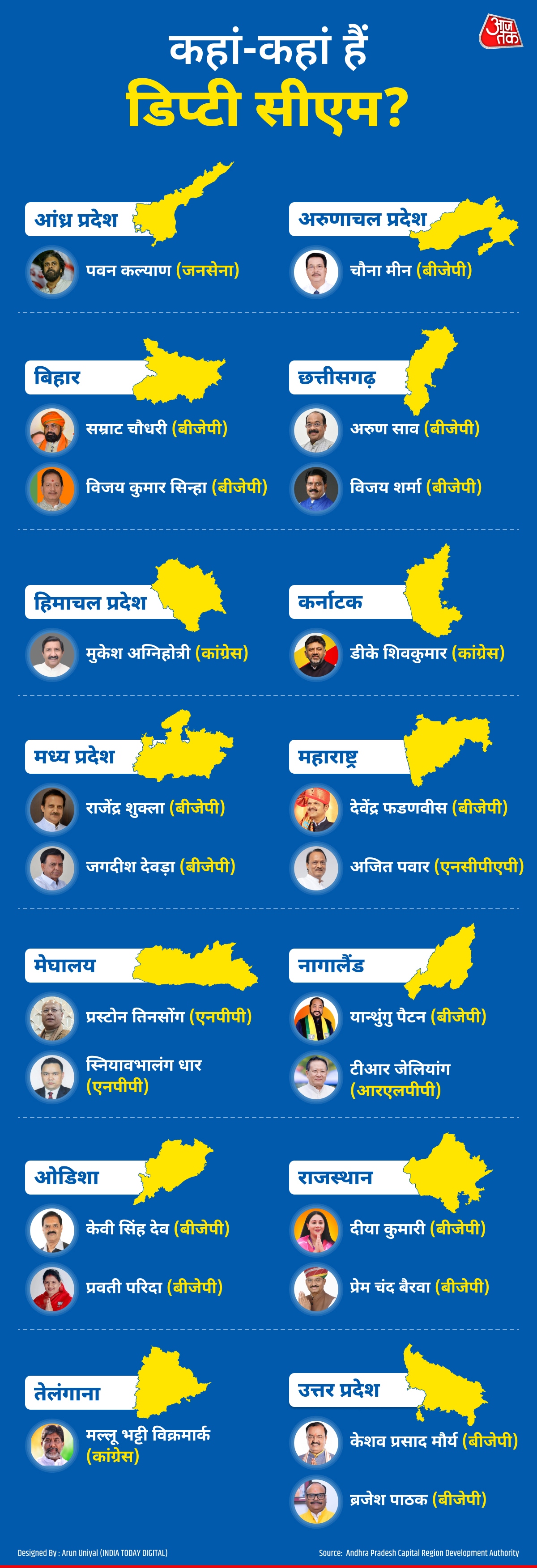 The remaining nine states–Bihar, Chhattisgarh, Madhya Pradesh, Maharashtra, Meghalaya, Nagaland, Odisha, Rajasthan, and Uttar Pradesh feature two Deputy CMs each. Of the total, 15 Deputy CMs represent the BJP, 3 from the Congress, while 5 belong to other parties.