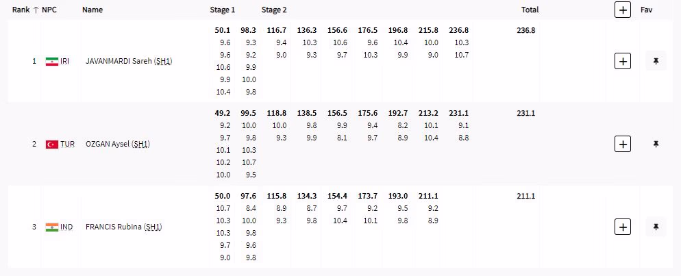 Iran's Sareh Javanmardi secured the gold with 236.8 points, while Turkey's Ayșe Ozgan took home the silver with 231.1 points. Rubina was at the second position at one point but eventually slipped to third. The SH1 category in shooting features participants with arm, lower torso, or leg impairments or disabilities.