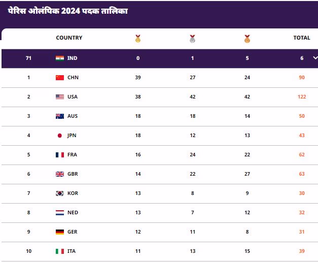 India's first medal in Paris 2024 was a bronze in shooting, secured by Manu Bhaker in the women's 10m air pistol event. Manu, alongside Sarabjot Singh, also clinched another bronze in the mixed team event. Swapnil Kusale earned the third bronze in the men's 50m rifle three-position event. The Indian men's hockey team bagged a bronze, followed by Neeraj Chopra who won a silver in javelin throw. Wrestler Aman Sehrawat contributed another bronze in the men's 57 kg freestyle event.