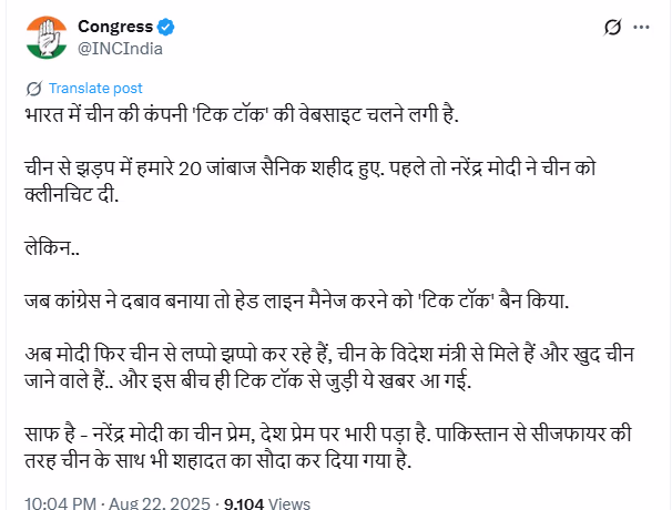In a recent statement, Congress criticized the government, saying China's company 'TikTok' is operational again in India. They pointed to the tragedy where 20 brave soldiers lost their lives during India-China skirmishes. Initially, PM Narendra Modi had given China a clean chit, but when Congress exerted pressure, he managed headlines by banning 'TikTok.' Now, he is engaging diplomatically with China, meeting with China's Foreign Minister, and even planning a visit, all while news of TikTok’s return emerges. Congress declares it clear that PM Modi's affinity for China outweighs his patriotic duty, comparing it to similar dealings with Pakistan.