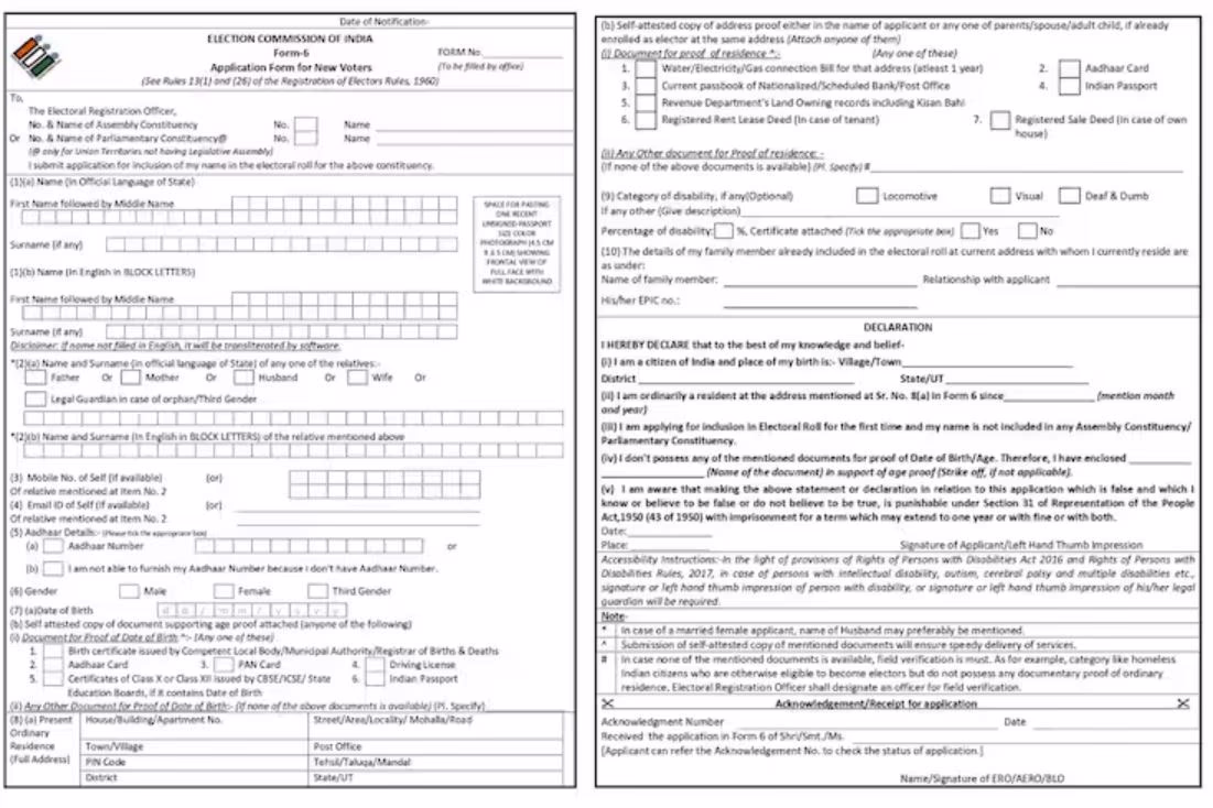 Issued by the Election Commission, Form 6 is used by Indian residents aged 18 or above to register as voters in their locality.