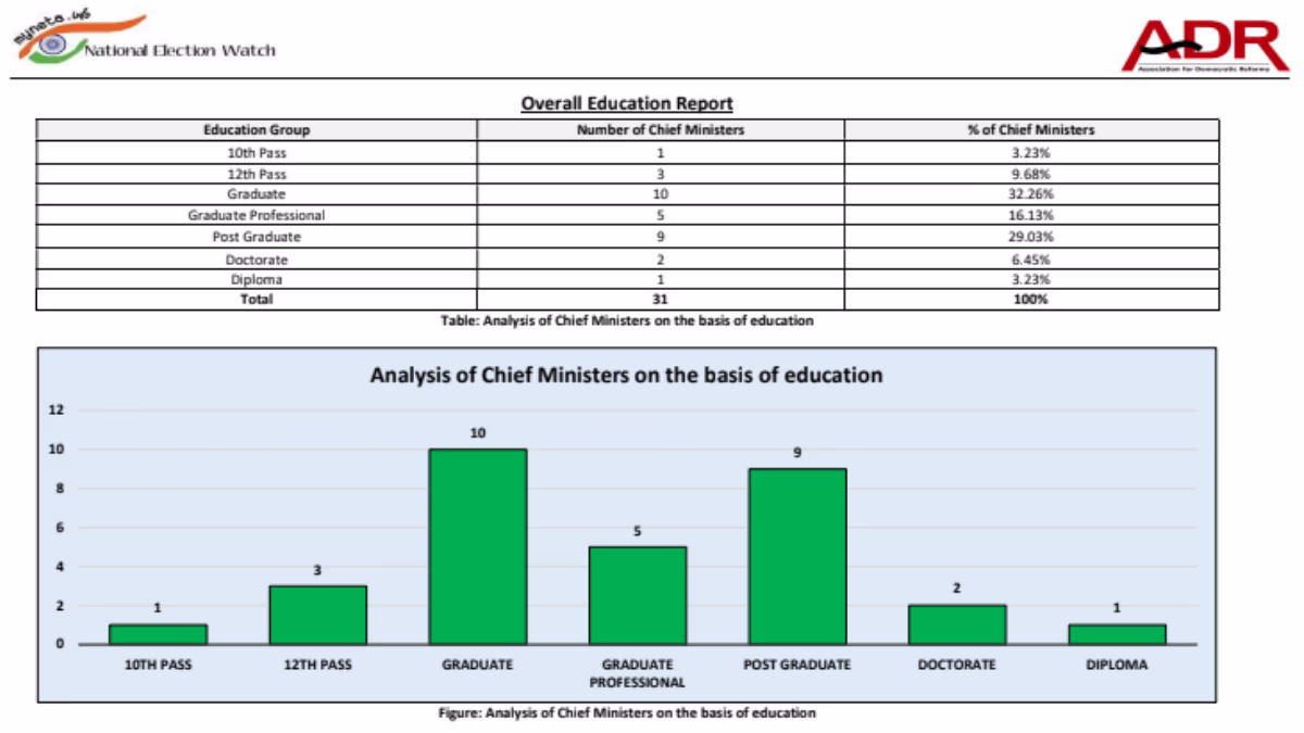 The ADR report also reveals that 13 (42%) Chief Ministers have declared criminal cases against them, while 10 (32%) have acknowledged serious charges like attempted murder, kidnapping, bribery, and criminal intimidation.