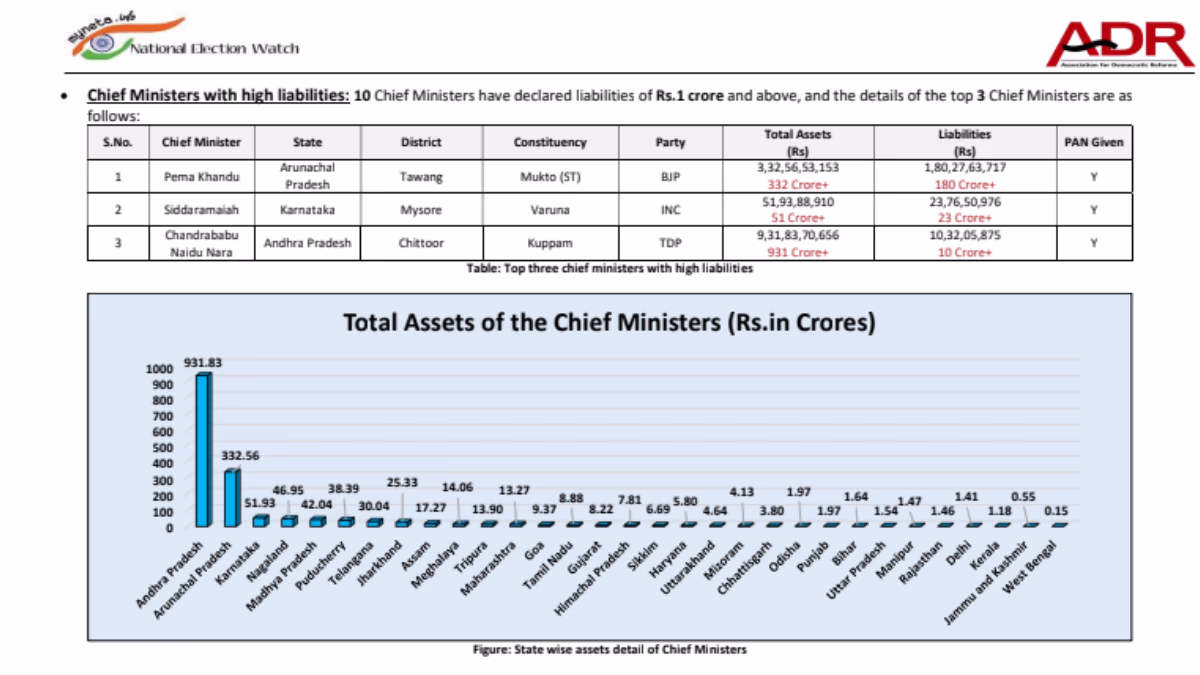 The report notes that Pema Khandu of Arunachal Pradesh holds the second position with assets over ₹332 crore. Karnataka's Siddaramaiah follows with assets exceeding ₹51 crore. On the other end, Jammu & Kashmir's Omar Abdullah has assets worth ₹55 lakh, marking him as the second-least wealthy Chief Minister.
