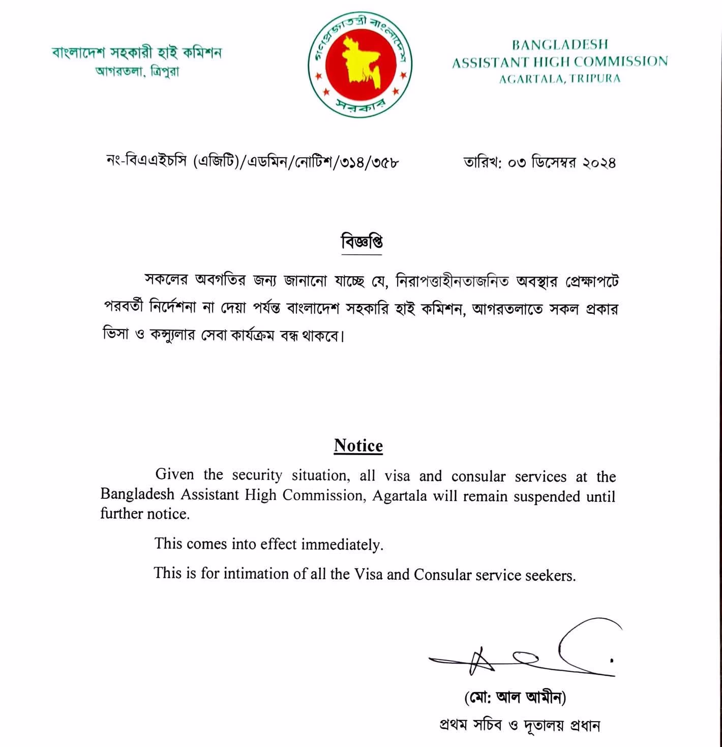 Protestors allegedly vandalized the Assistant High Commission of Bangladesh in Agartala, an act described by the Ministry of External Affairs as "deeply regrettable." Nazrul accused the group Hindu Sangharsh Samiti of targeting the mission and desecrating the Bangladeshi national flag.