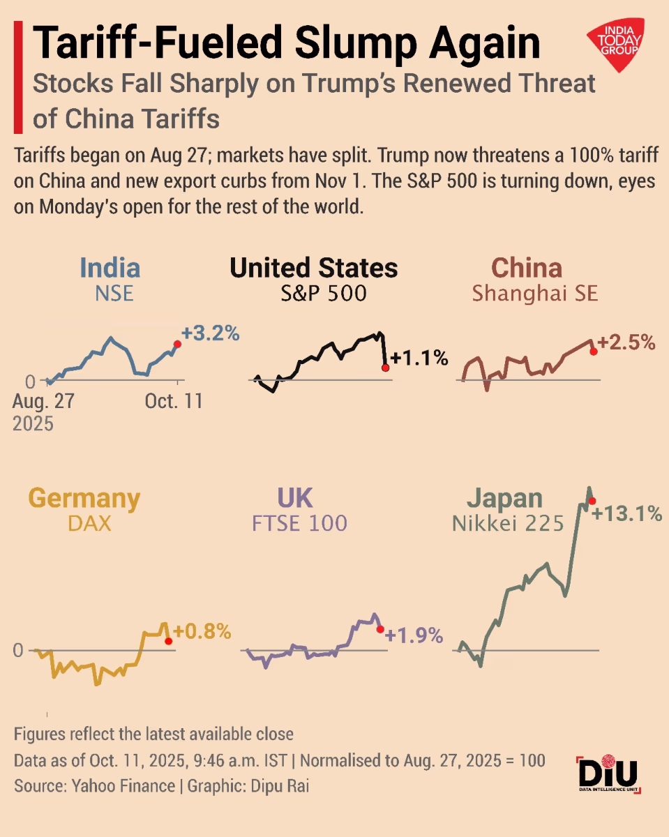 Donald Trump has threatened to impose a 100% tariff on Chinese imports, effective from November 1, 2025. This announcement has caused significant turmoil in both the US and Chinese stock markets. Indian investors are now anxious, trying to predict what will happen when the Indian market opens on Monday.