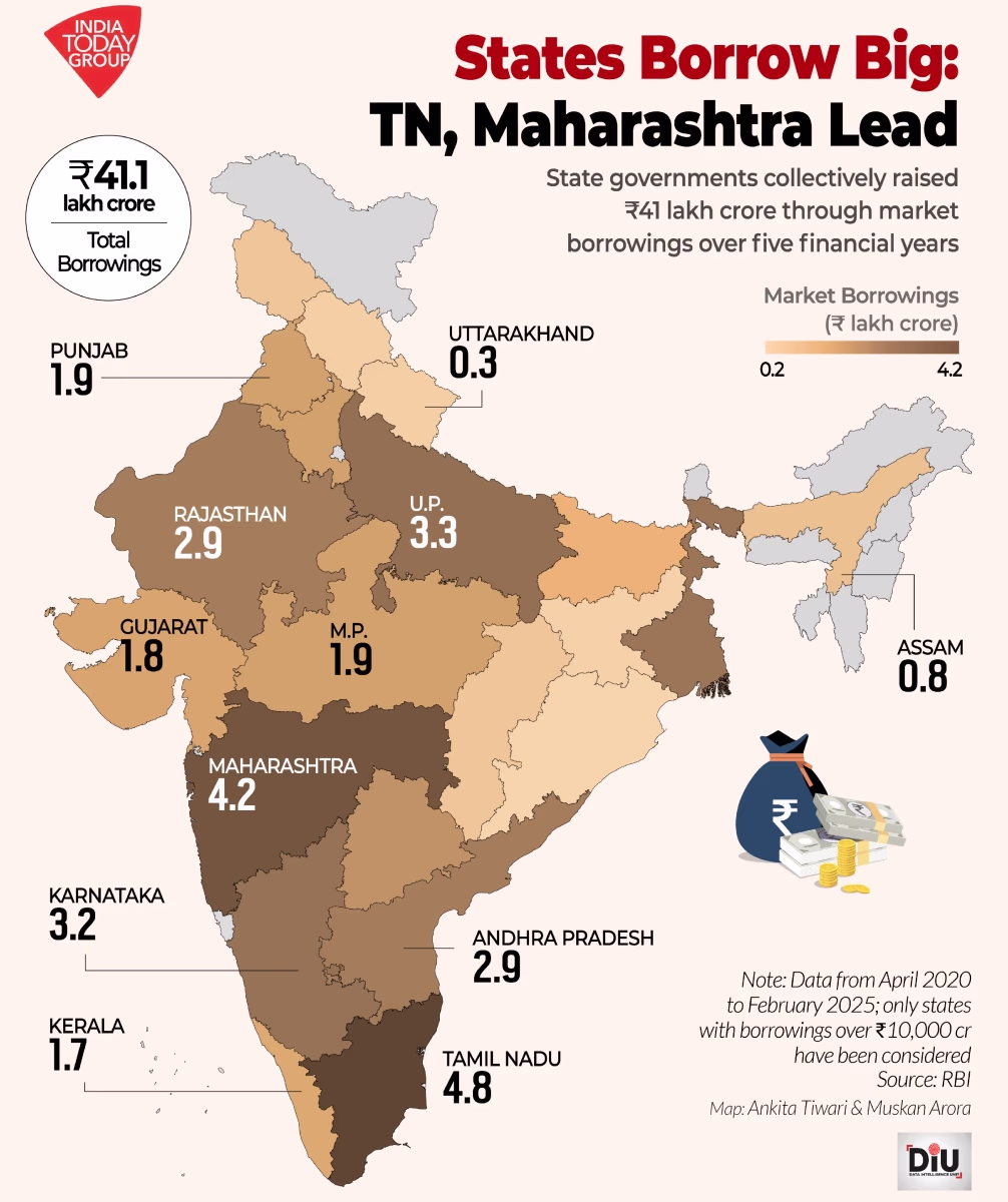 The debt of Indian states has been on a continuous upward trajectory. Over the past five years, state debt has grown significantly. According to the Reserve Bank of India's (RBI) data, Tamil Nadu has consistently been the leader among Indian states in terms of borrowing, reaching ₹101,025 crore from April 2024 to February 2025.