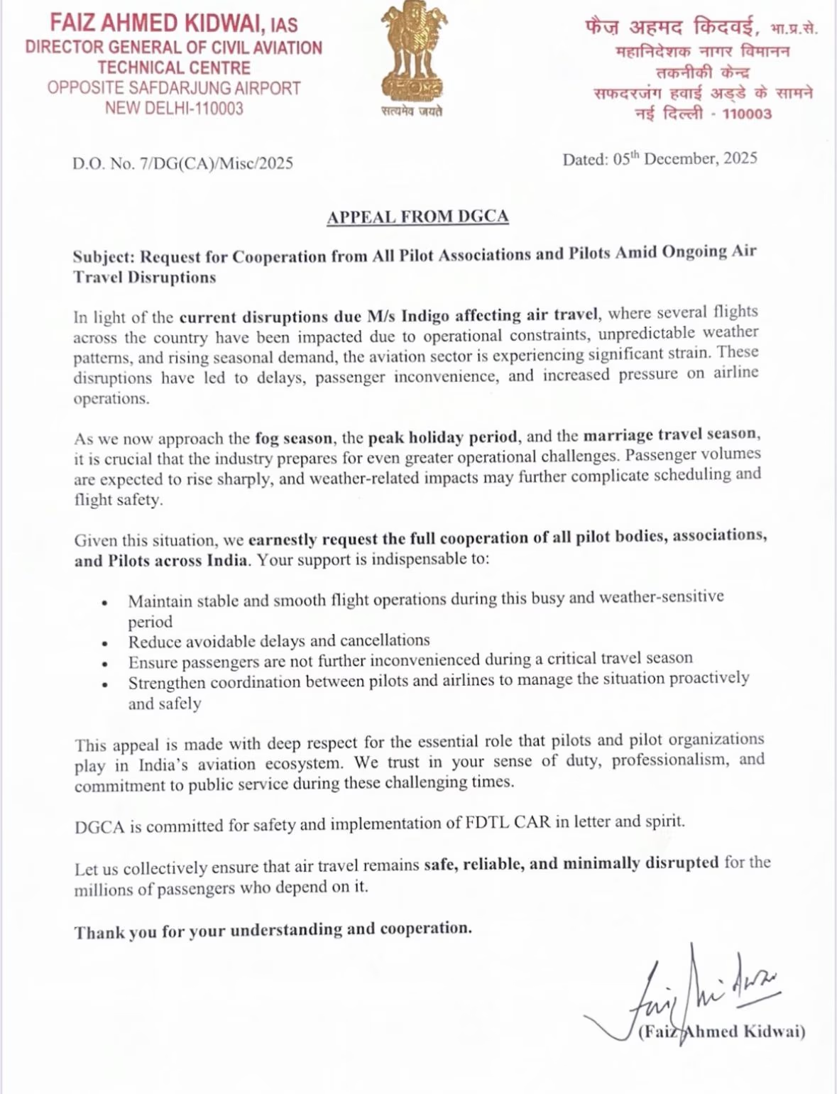 Amid the ongoing disruptions affecting flights nationwide, DGCA has issued an appeal to all pilot associations. It stressed the need for pilot cooperation due to the rising stress in air travel. DGCA warned that foggy weather and holiday crowds could worsen delays, urging airlines to prepare for the increased passenger numbers ahead of the peak travel and wedding season.