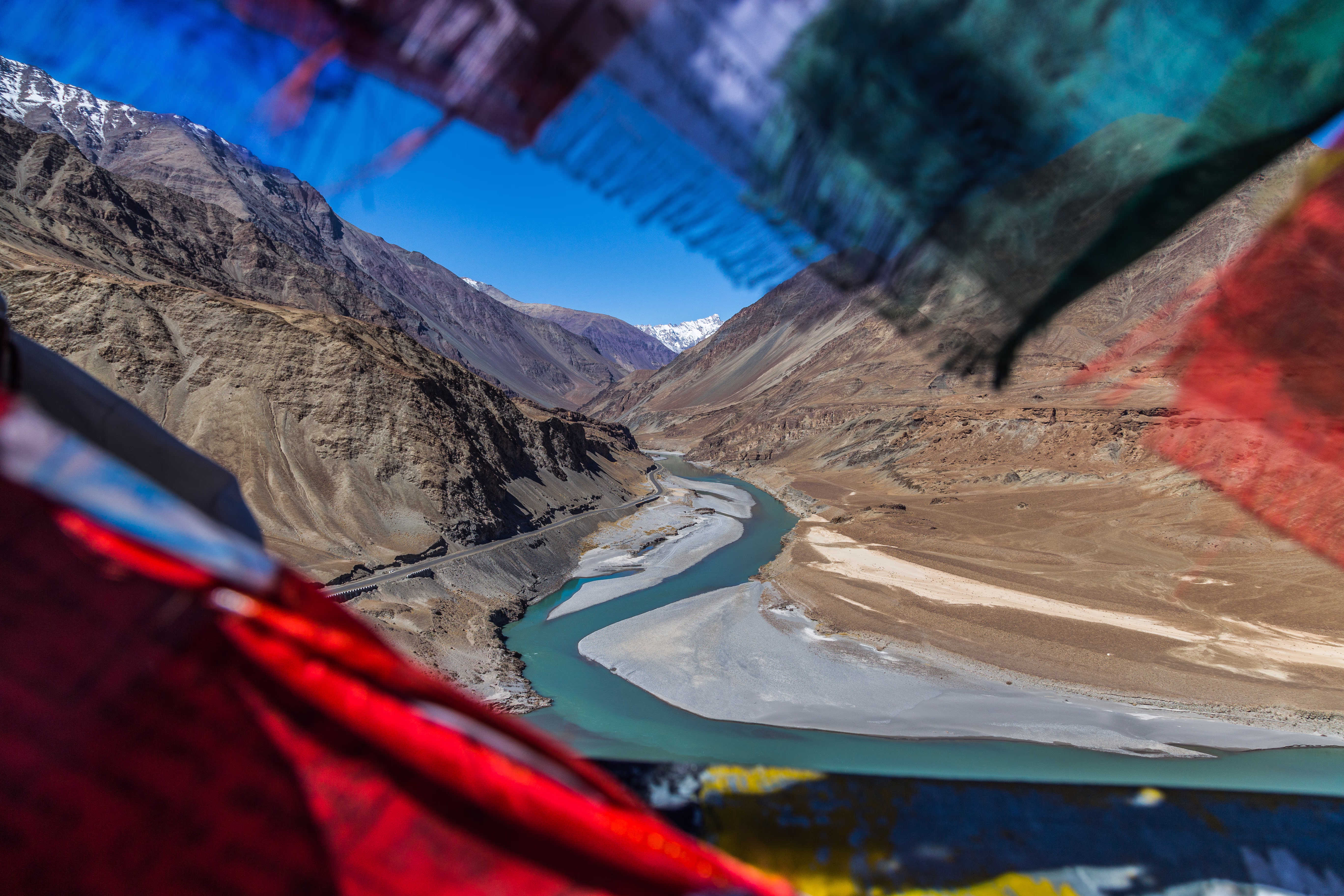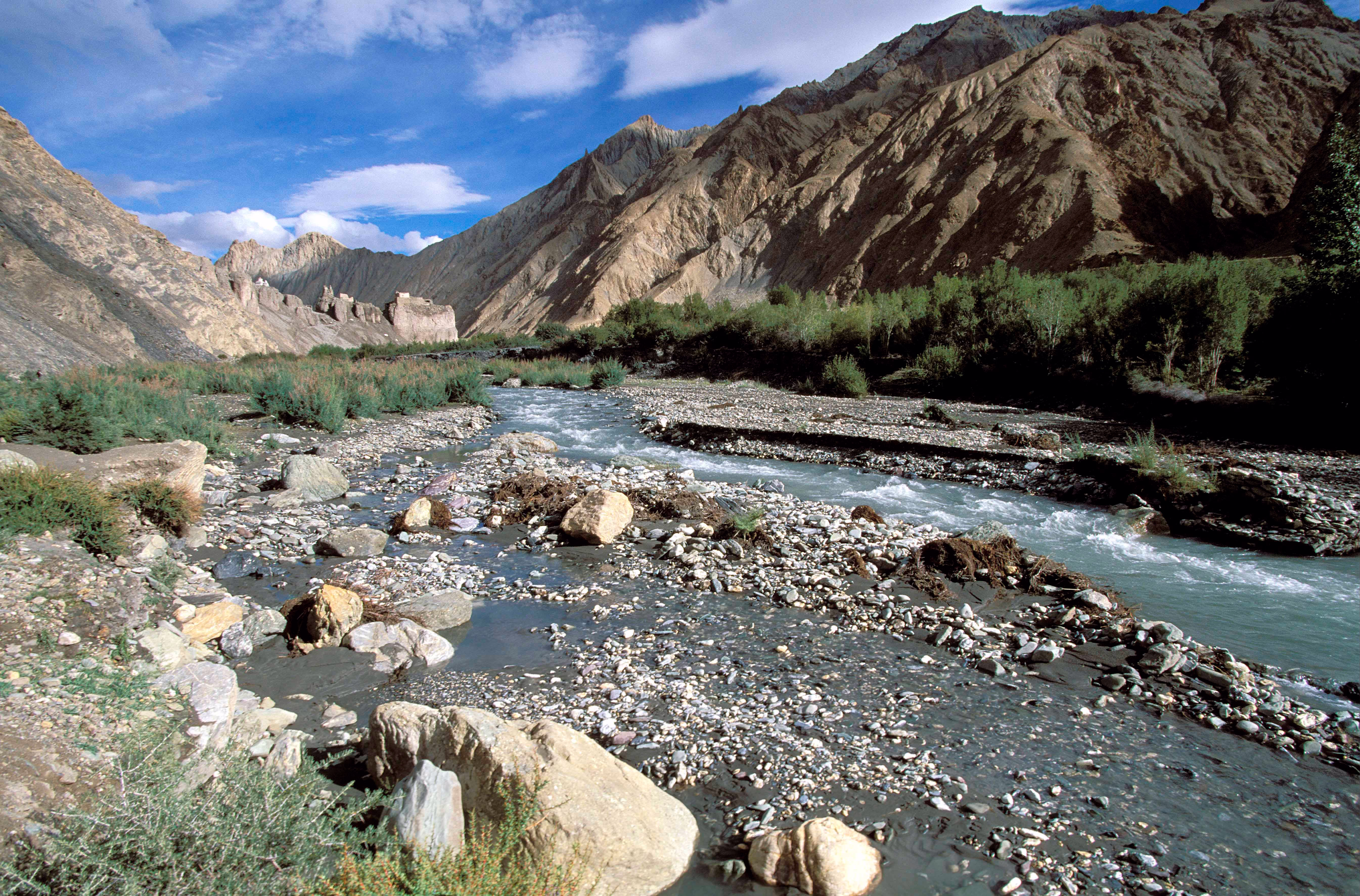 This basin stretches across longitudes 72°28’ to 79°39’ and latitudes 29°8’ to 36°59’ in India, with a maximum length of 756 km and a width of 560 km. It is bordered by the Himalayas in the east, the Karakoram and Haramosh ranges in the north, the Sulaiman and Kirthar mountains in the west, and the Arabian Sea to the south. Originating near the sacred Lake Manasarovar in Tibet from the Sin-ka-Bab stream at an elevation of 5,182 meters, the Indus River courses through Tibet and Kashmir before descending into Pakistan, covering a distance of 2,880 km, with 1,114 km flowing within India.