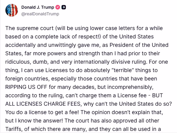 He added that the court has ratified all other tariffs, and there are plenty. Now, they can be enforced far more powerfully and aggressively with legal certainty. Our incompetent Supreme Court has done a massive favor for the wrong people, and they should be ashamed.