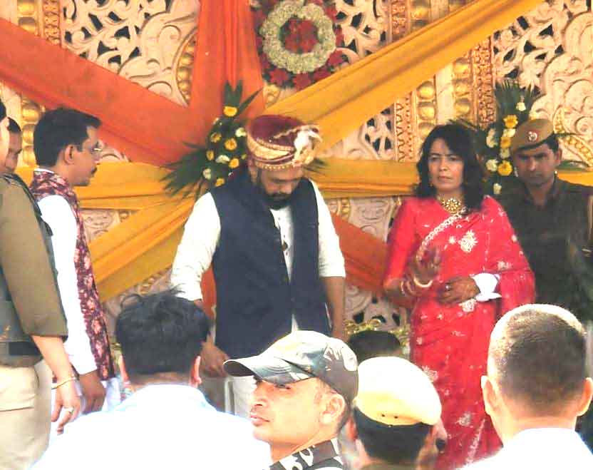 By the high court's order, gangster Kala Jatheri was granted parole today from 10 a.m. to 4 p.m., necessitating the completion of all rituals before 4 p.m. Sandeep arrived at the banquet hall directly from Tihar Jail with heavy security. After arriving, he changed his attire and briefly joined his soon-to-be wife Anuradha Chaudhari on stage, before proceeding to the wedding mandap where he adorned the lady don with vermilion.
