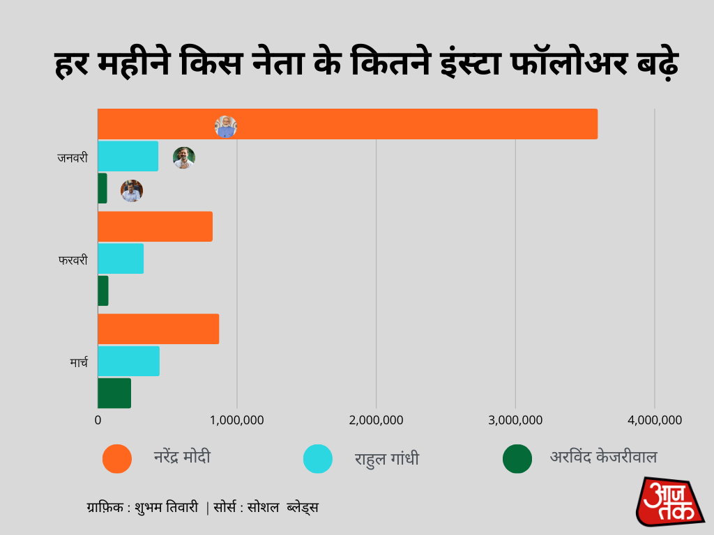 On Instagram, about 88 million users follow PM Modi. Between January and March, he added 5.2 million followers. Rahul Gandhi increased his following by 1.2 million, and Kejriwal by 300,000 during the same time.