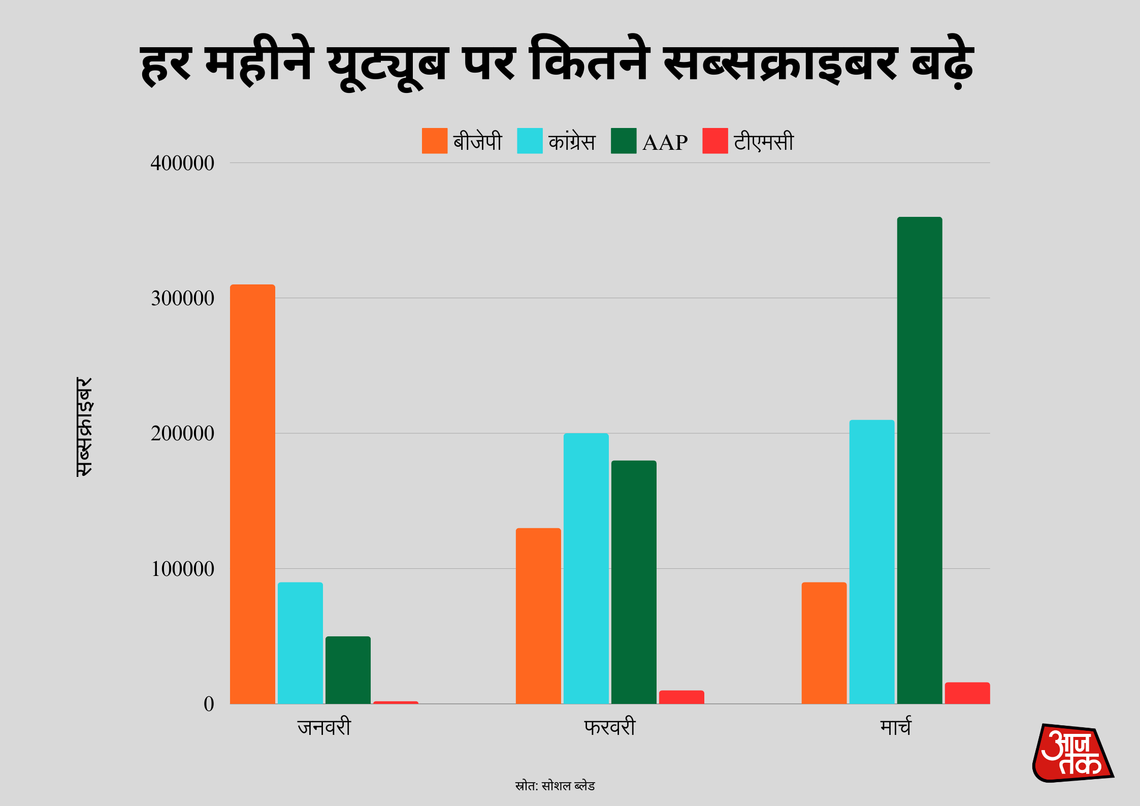 This year's first quarter saw BJP's YouTube channel increase by 530,000 subscribers and Congress by 500,000. TMC only increased by 28,000 subscribers.