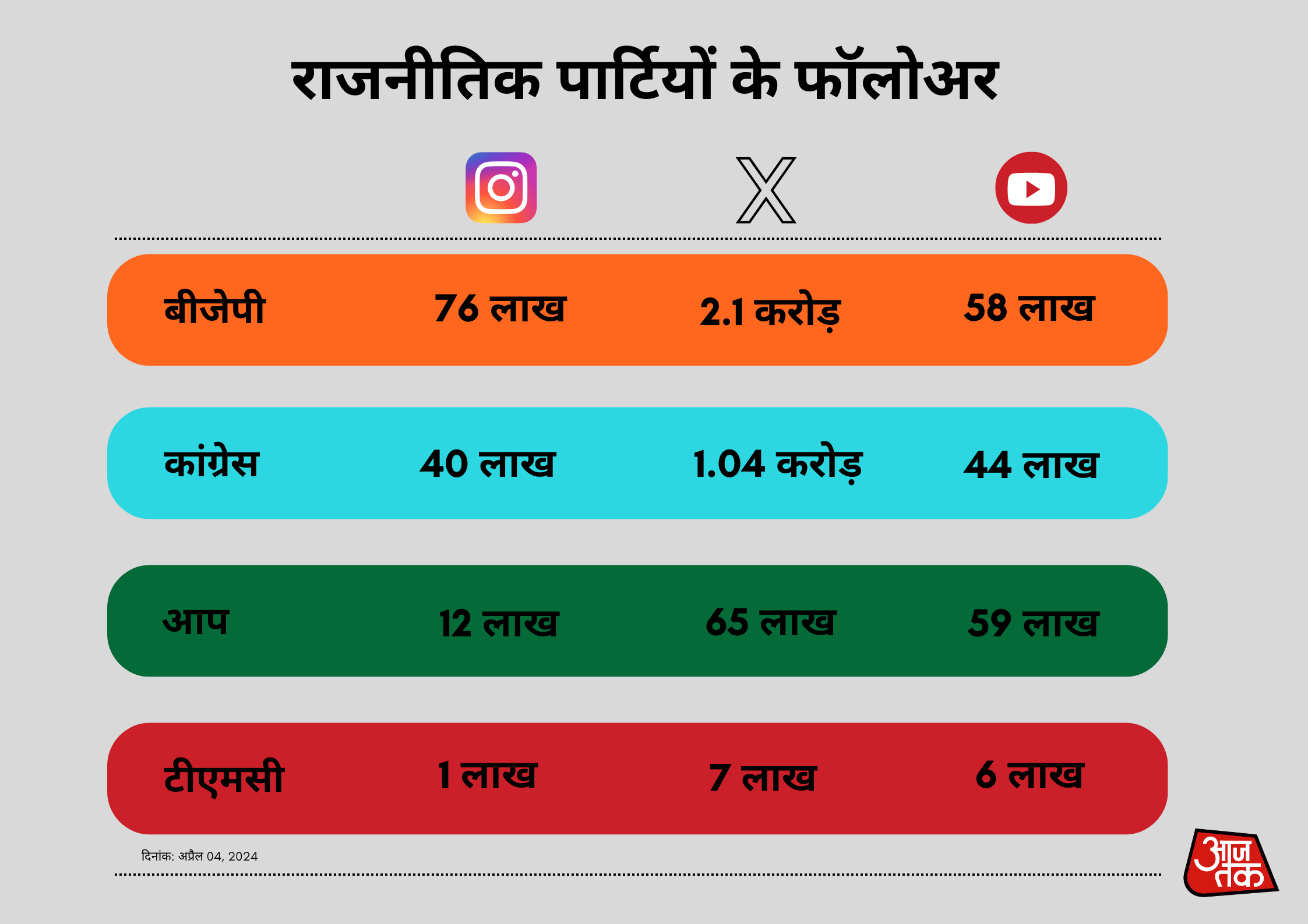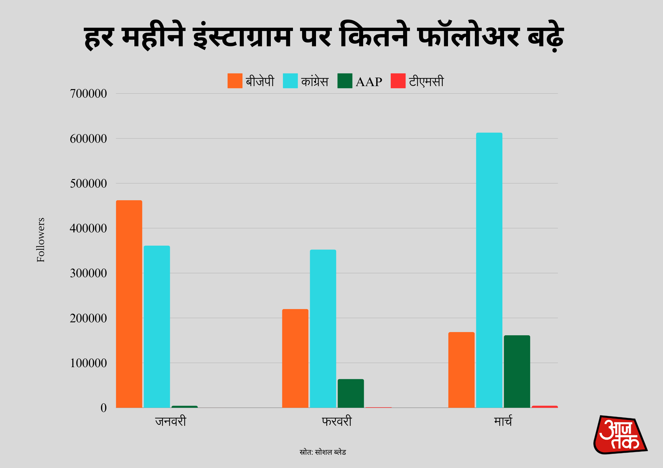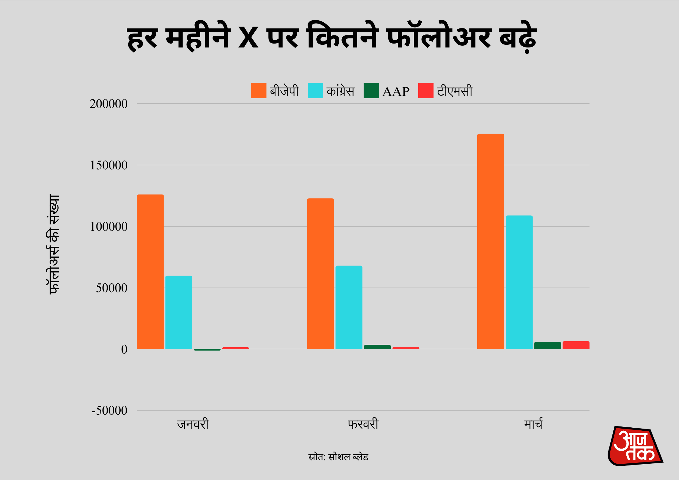 India Today's Open-Source Intelligence team (OSINT) analyzed the social media page growth of BJP, Congress, Aam Aadmi Party (AAP), and Trinamool Congress (TMC), along with the metrics for these political parties' leaders for January, February, and March.