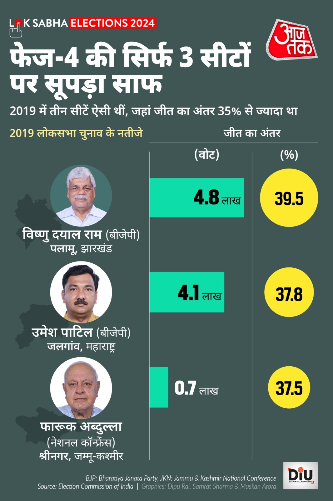 The BJP secured wins in Palamu by 37.8% and Jalgaon by 39.5%. Meanwhile, Farooq Abdullah triumphed in Srinagar with a 37.5% margin.