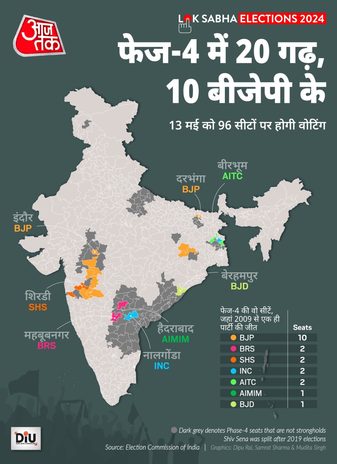 Out of the 96 seats in the fourth phase, 20 are known strongholds of particular parties, including Mahbubnagar, Medak, Maval, Shirdi, Brahmapur, Nalgonda, Ahmednagar, Beed, Darbhanga, Indore, Jalgaon, Jalna, Khargone, Khunti, Lohardaga, Raver, Berhampur, Birbhum, Krishnanagar, and Hyderabad.