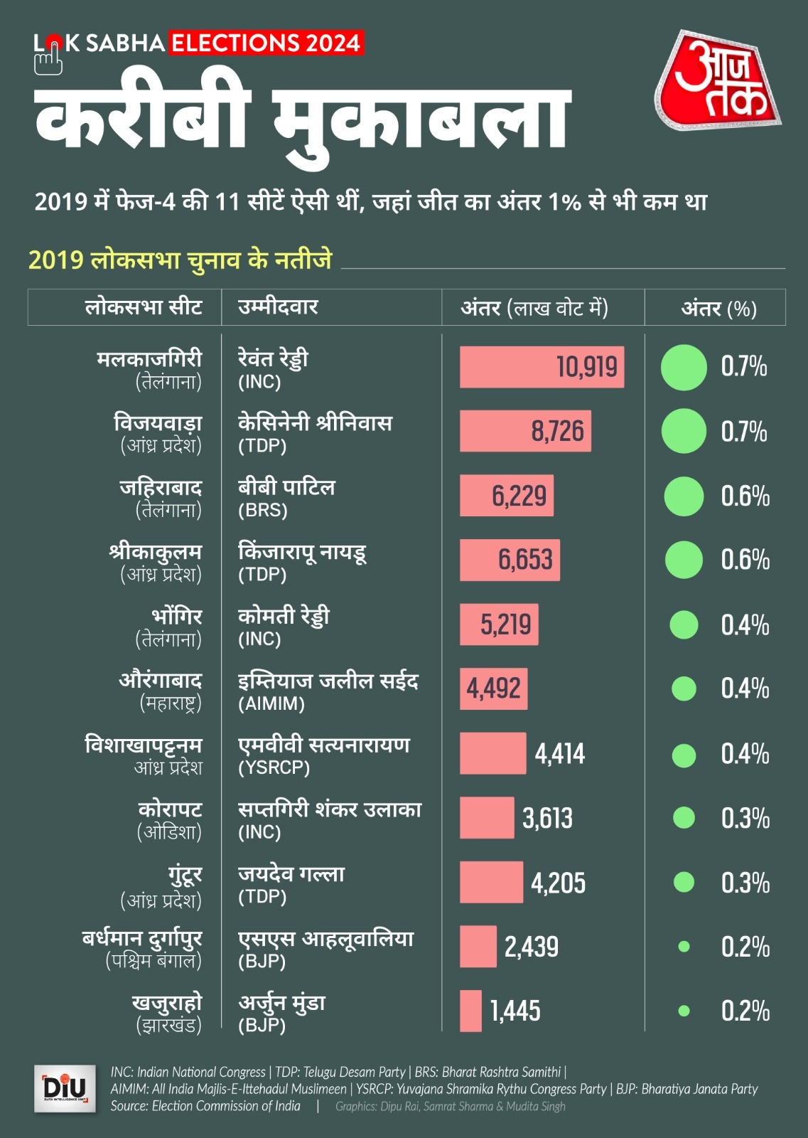 In 2019, there were 11 seats in phase four that saw victories by a margin of less than one percent. The Telugu Desam Party (TDP) clinched wins in Andhra Pradesh's Vijayawada by 0.7%, Srikakulam by 0.6%, and Guntur by 0.4%. Similarly, Congress emerged victorious in Telangana's Malkajgiri by 0.7% and Bhongir by 0.4%. Visakhapatnam, Khunti, Aurangabad, Koraput, Zahirabad, and Bardhaman-Durgapur also experienced tight races.