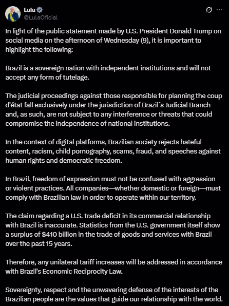 In an official statement, President Lula's office emphasized that Brazil would respond based on its Economic Reciprocity Law, raising fear of an intensified trade war between the two nations.