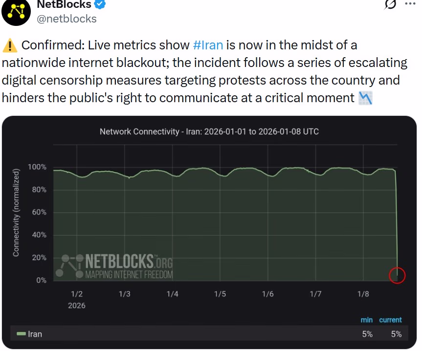 With the situation growing uncontrollable, the Iranian government has disabled internet services and cut telephone lines. The internet monitoring group NetBlocks reported that real-time data indicated disruption among several service providers, causing many areas in the country to go offline.