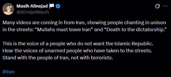 Iranian-American journalist Masih Alinejad, via social media platform X, shared videos where voices ring out in unison with cries of 'The clerics must leave Iran' and 'Down with dictatorship'. She highlighted this as the collective voice of a people desiring to leave the Islamic Republic behind. Iran, with over 92 million residents, faces dire economic hardships and worsening law and order that have put Khamenei's government in a deep crisis. This tumult comes when Iran is already under pressure due to actions at its nuclear sites from Israel and the US, alongside struggling with Donald Trump's 'Maximum Pressure Policy'.