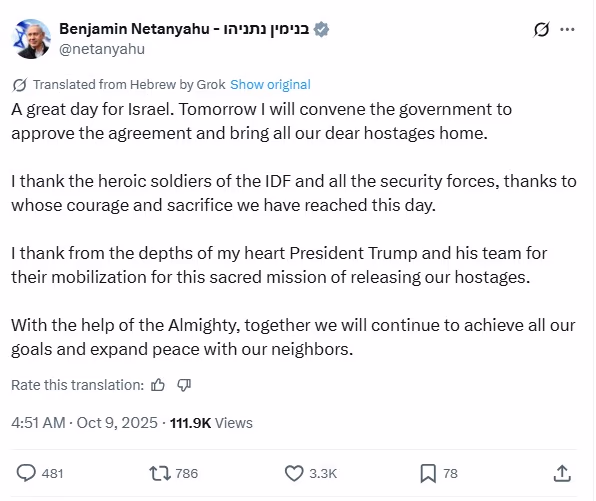 , 'This is a significant day for Israel. Tomorrow, I will present the government with an endorsement of this agreement and a plan to bring our precious hostages home. I extend my gratitude to the valiant soldiers of the IDF and all security forces, whose courage and sacrifice have brought us to this point. I wholeheartedly thank President Trump and his team for their efforts to liberate our hostages. Together, we will continue achieving all our objectives and expanding peace with our neighbors.'