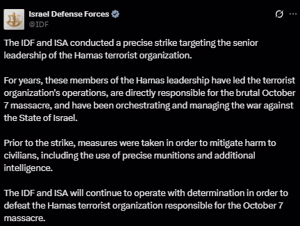 However, Israeli Prime Minister Netanyahu declared the operation as an autonomous mission. He wrote on social media platform X, "Today's mission against the top terrorist commanders of Hamas was a fully independent Israeli operation. Israel initiated it, drove it, and stands by it entirely."