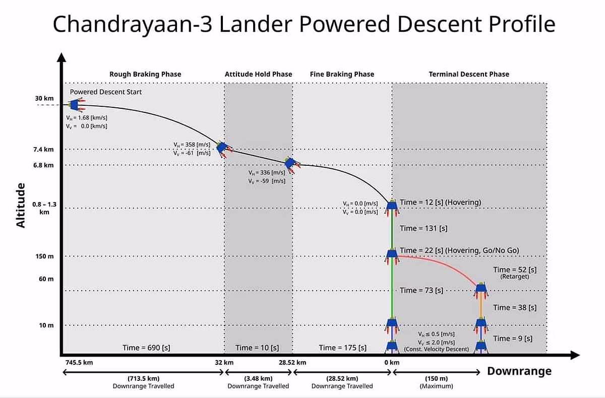 From the landing site, Chandrayaan-3 was 30 kilometers in altitude and 745.6 kilometers away from the surface. The landing was divided into four phases.