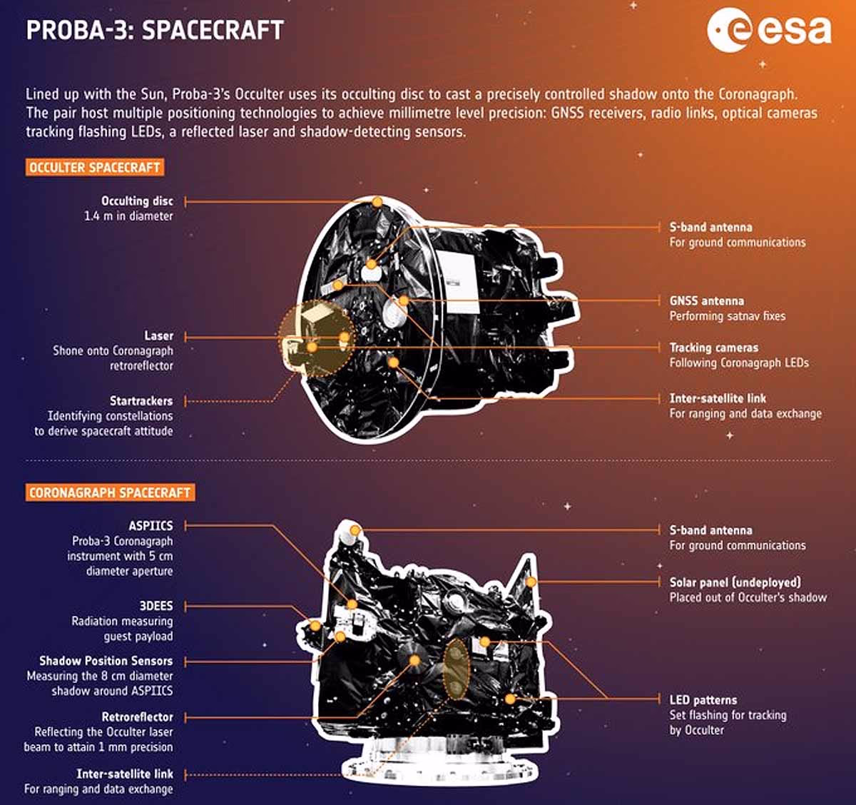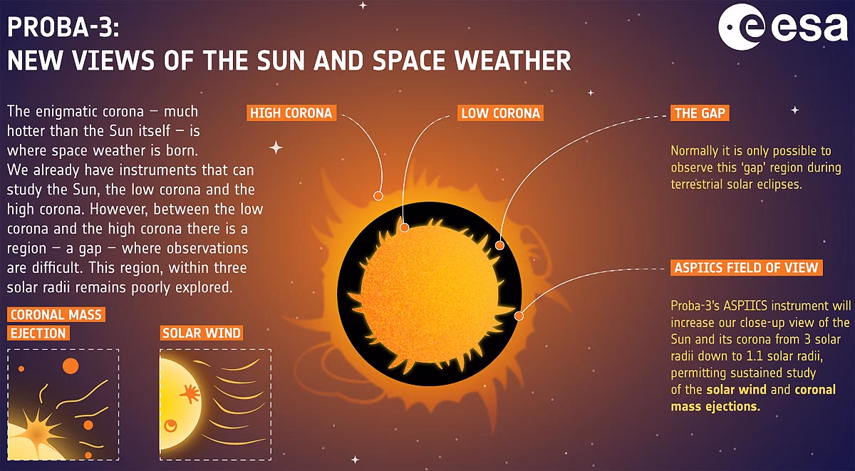 This 310-kilogram satellite will face the Sun, equipped to target using laser and visual-based instruments. It features ASPIICS—an association of spacecraft for the polarimetric imaging and investigation of the Sun's corona—alongside the 3DEES, a 3D energetic electron spectrometer. These instruments will study the gap between the Sun's outer and inner corona while positioning itself like the Moon does during a solar eclipse.