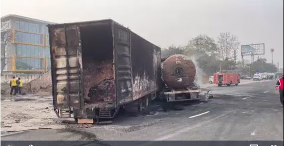 The incident occurred around 6 AM on the Jaipur-Ajmer Highway. Some 20-22 fire brigades have been tirelessly working to control the fire, which still rages on even after two and a half hours. The volatile materials from both vehicles intensified the destruction, stretching over a kilometer of highway, leaving scorched vehicles scattered in the aftermath.