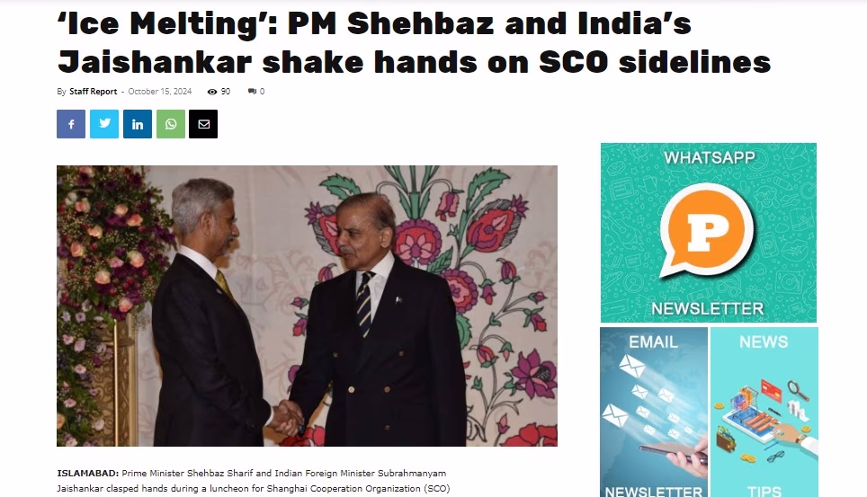 The paper reported, 'During a banquet organized for Shanghai Cooperation Organization leaders, Prime Minister Shehbaz Sharif and Indian Foreign Minister Jaishankar shook hands—an unusual meeting between leaders of the rival neighboring countries. Jaishankar's trip marks the first by an Indian minister in nearly ten years.'