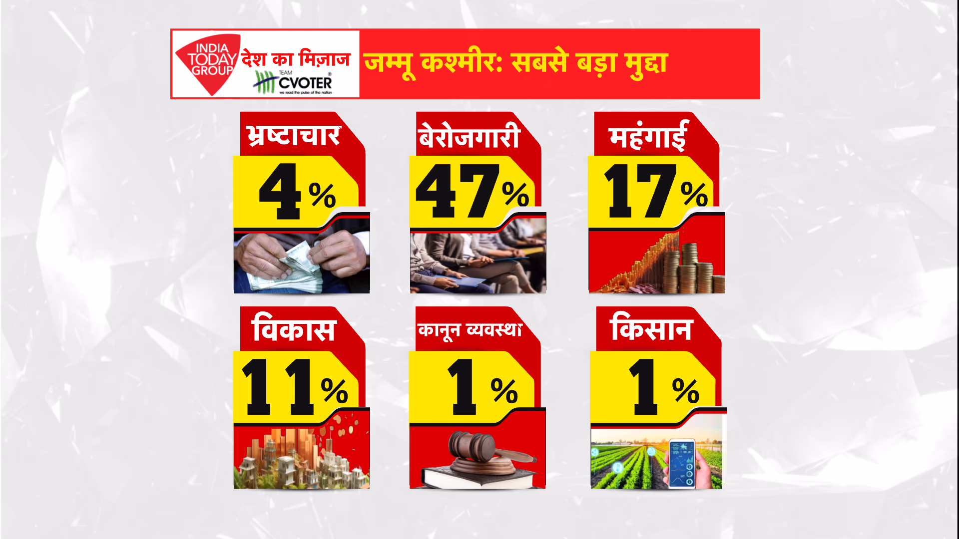 The announcement for the Jammu and Kashmir Assembly elections has been made. The elections will be held in three phases in Jammu and Kashmir on September 18, 25, and October 1. The results will be declared on October 4. Before the assembly elections in the union territory, Aajtak conducted the 'Mood of the Nation' survey to gauge public opinion. According to the 'Mood of the Nation' survey, 47% of people in Jammu and Kashmir believe unemployment is the biggest issue.