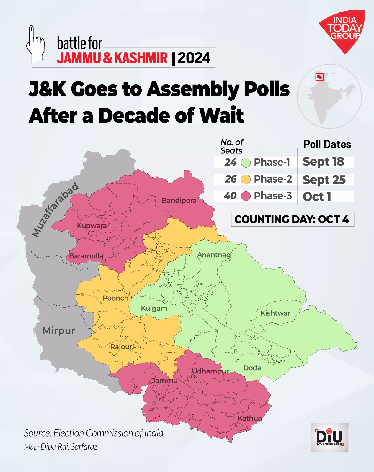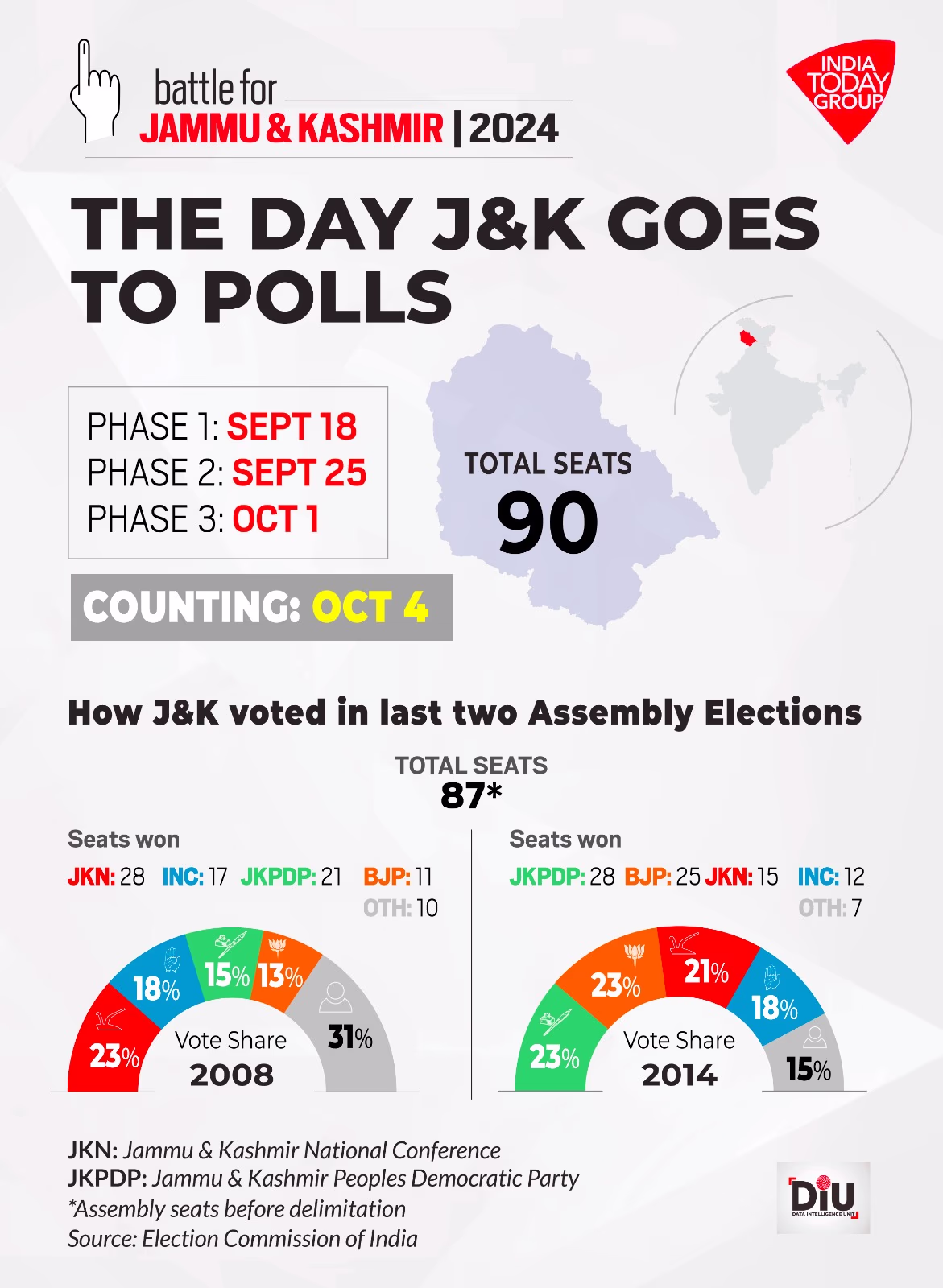 The last assembly elections in Jammu and Kashmir were held in 2014, with voting for 87 assembly seats. Following delimitation, there are now 90 seats. In the 2024 general elections, a turnout of 65.52 percent was recorded in Jammu and Kashmir.