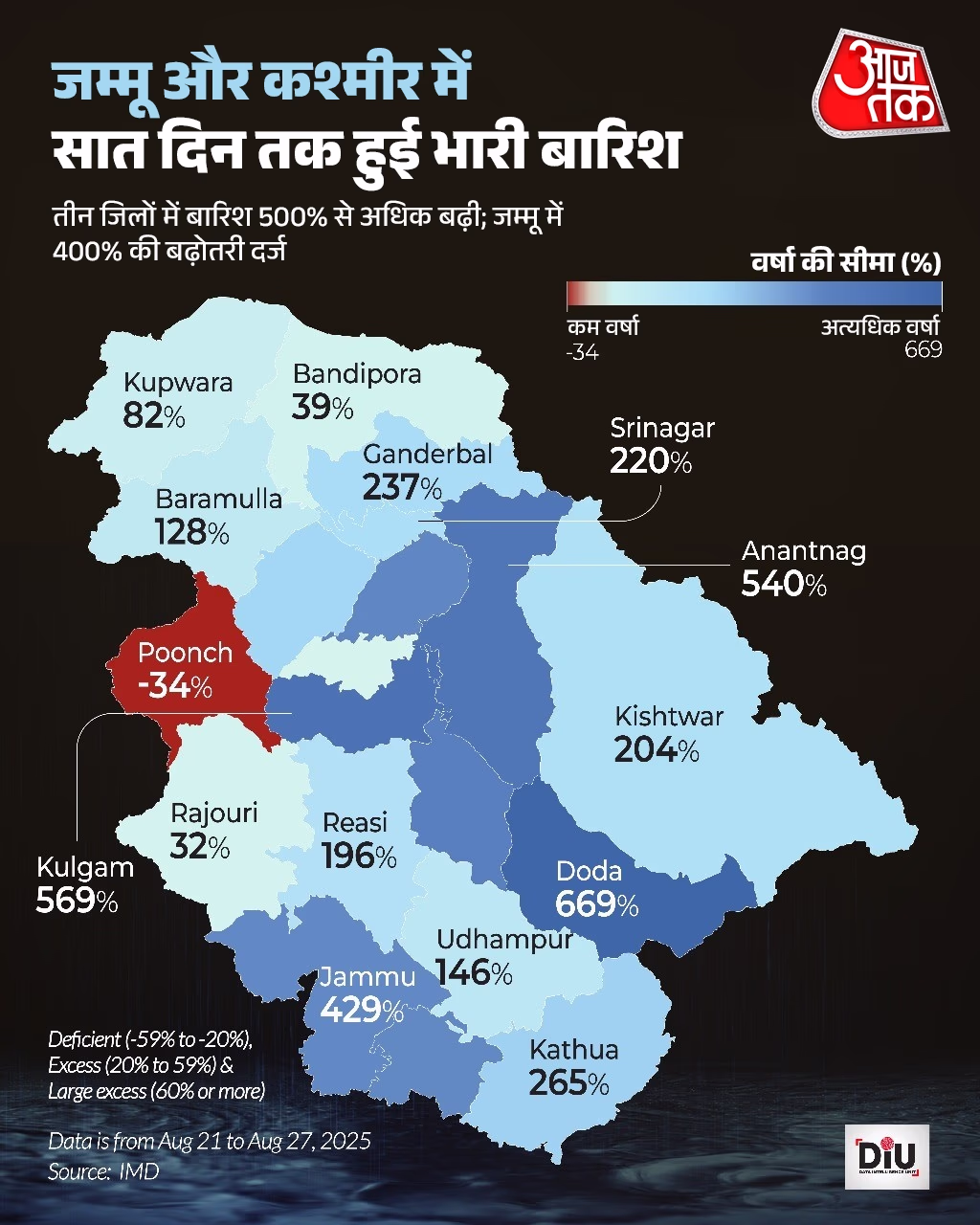 In the past seven days, rainfall in Jammu and Kashmir has been 260% above normal. According to IMD data, Anantnag, Doda, and Kulgam were the most affected, experiencing over 500% more rain than usual. Similar situations were observed in Pulwama, Ramban, Samba, and Jammu, while Poonch district recorded a 34% decrease in rain.