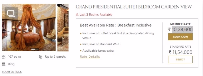 Due to JD Vance's visit, bookings at Rambagh Palace were closed from April 1st to 23rd for security reasons. However, for those interested, a standard night's stay in the Grand Presidential Suite is priced at 1.154 million rupees. For members, the rate is a more modest 1.038 million rupees.