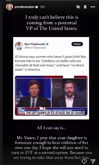 In response to this old video, 'Friends' star Jennifer Aniston expressed her disbelief that a potential Vice President would say such things. She remarked, 'Mr. Vance, I hope one day your daughter can have children of her own. I hope she doesn't have to rely on IVF as an option.'