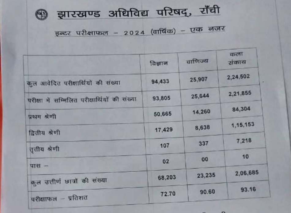 The Jharkhand Board 12th results show a pass percentage of 72.7% for male students and 72.67% for female students in Science. In Commerce, male students had a pass percentage of 88.40%, while female students scored an incredible 93.46%. In the Arts stream, 91.68% of male students and 94.22% of female students passed.