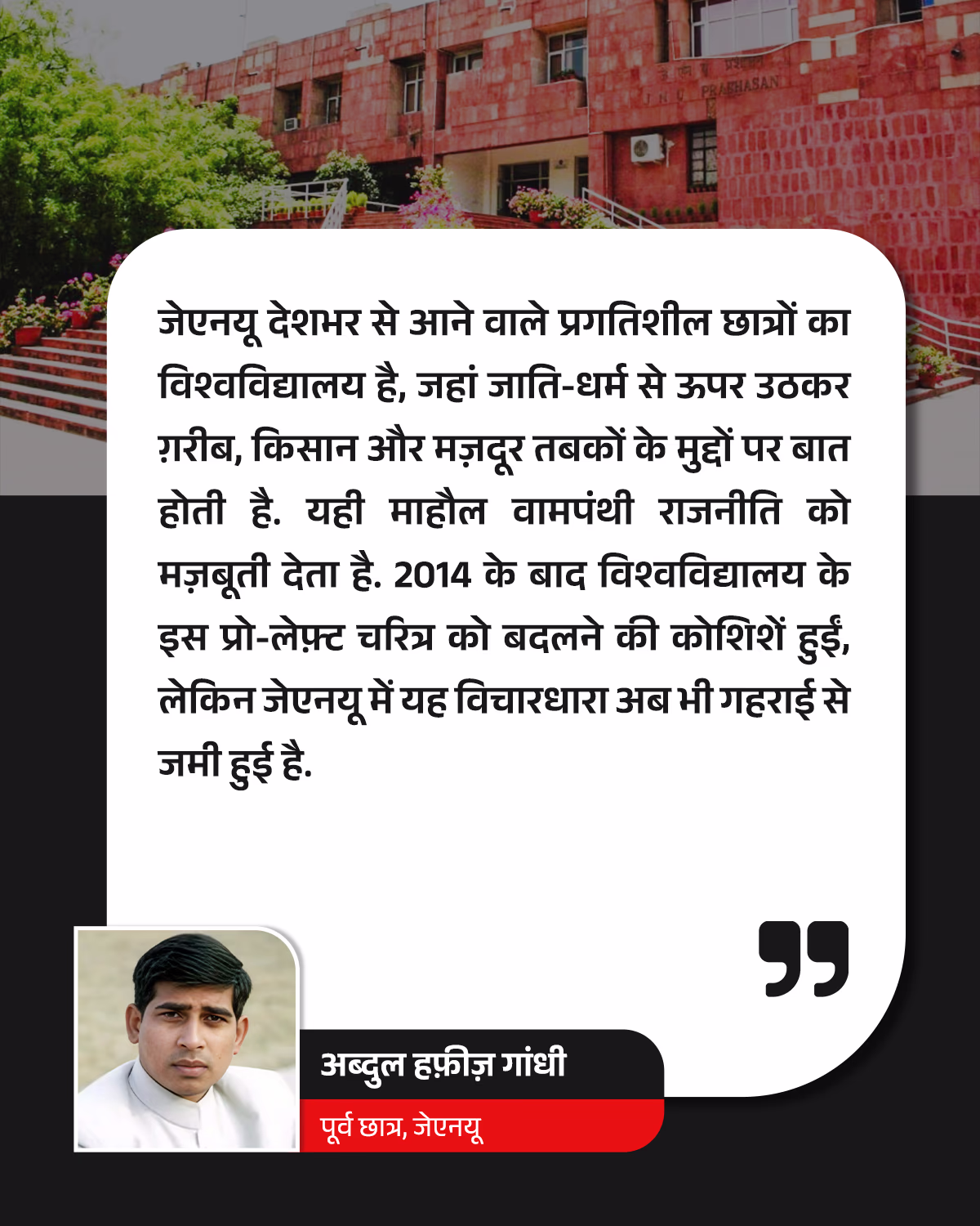 JNU alumni and expert on Left politics, Abdul Hafeez Gandhi, states, "JNU is a unique institution attracting individuals from every corner of India who are progressive and do not let caste or religion interfere. Their mission is advocating for the marginalized, the poor, and the labor class. In JNU, a prevailing culture exists to support the farmer, laborer, and impoverished, making Leftist influence predominant."