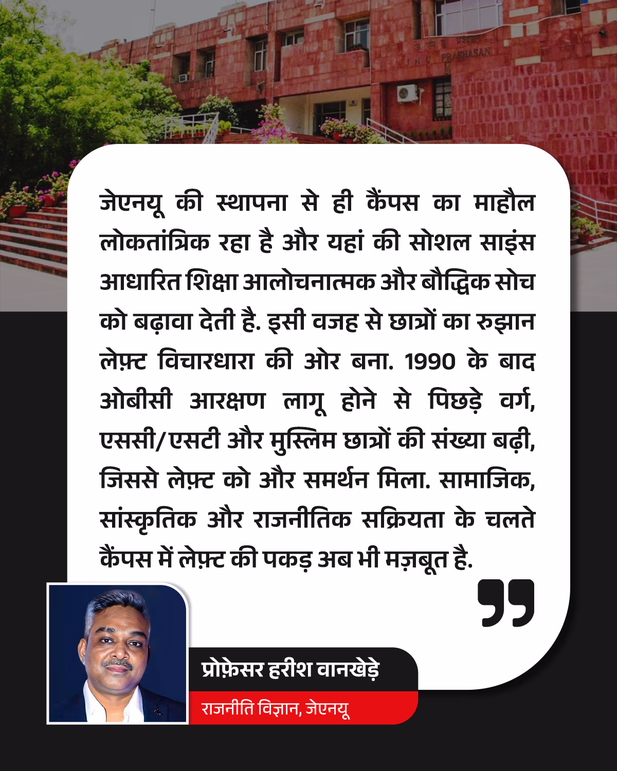 Professor Harish Wankhede from the Department of Political Science at JNU reflects in an interview with aajtak.in, "From the university’s foundation, JNU has thrived on a democratic atmosphere. As a social science university, it imparts an education focused on critical thinking, global perspectives, and intellectual rigour. This makes it easier for students to resonate with leftist ideologies, fostering a deep connection. Consequently, students have consistently supported the Left from the onset till today."