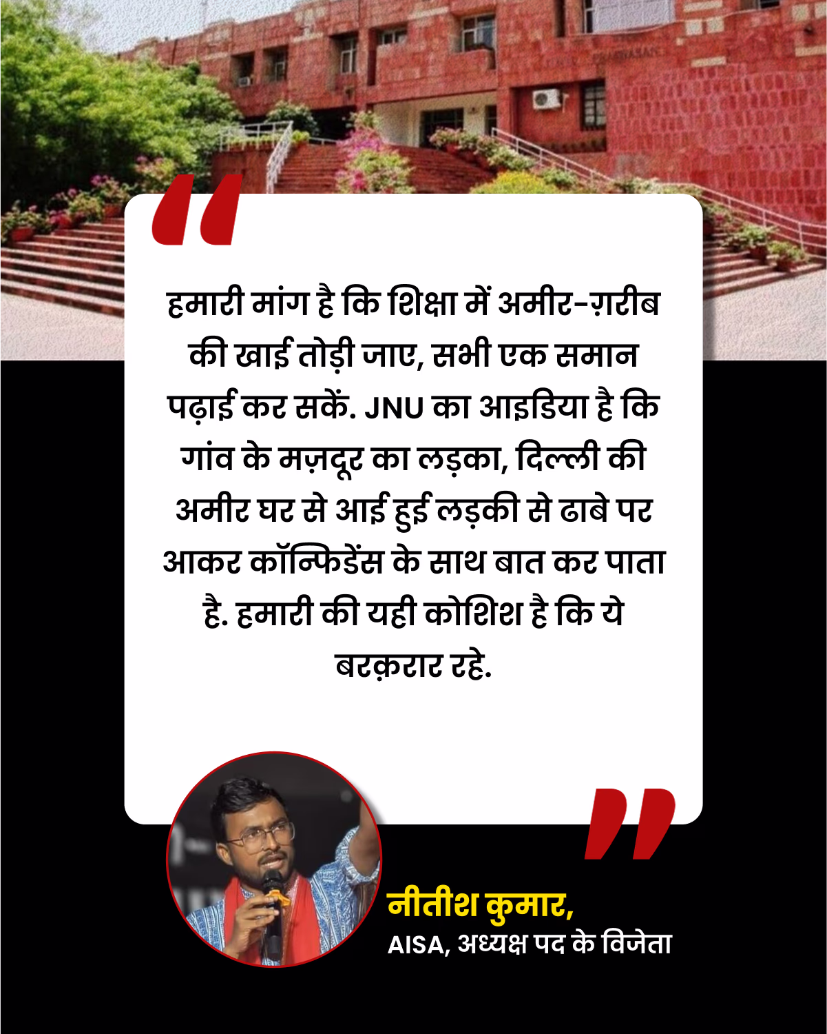 Speaking with aajtak.in, AISA's Nitish Kumar remarked, “The campaign in the campus wasn't for JNU's betterment, and students have rejected it. AISA has always advocated for struggle politics, standing up for students' minor and major issues. Those who stand in struggle are chosen by students. Our primary demand is to ensure that UGC funds reach JNU.”