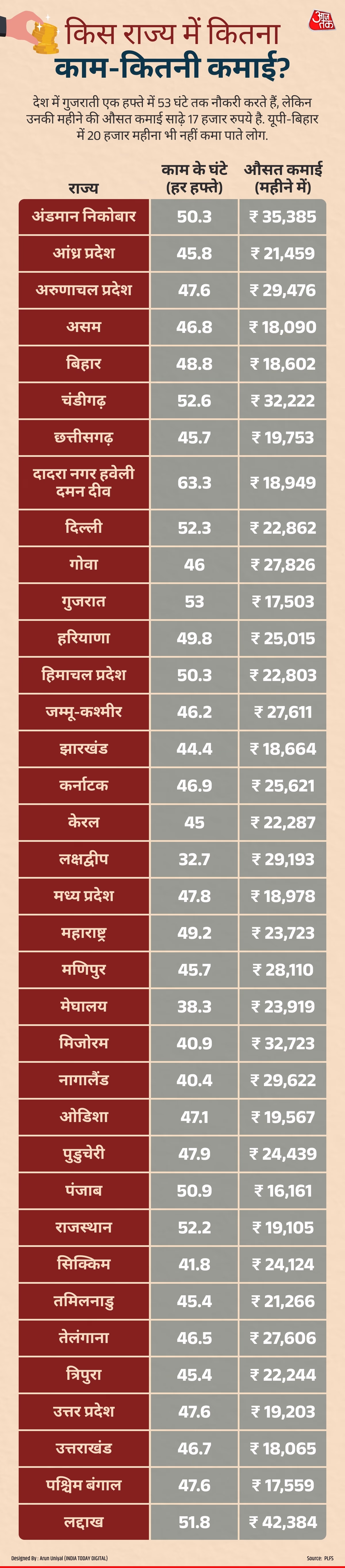 According to the PLFS report, Gujaratis work an average of 53 hours per week in their jobs, earning a monthly average of ₹17,500. In contrast, people in Lakshadweep work only 32.7 hours per week and earn more than ₹29,000 monthly.