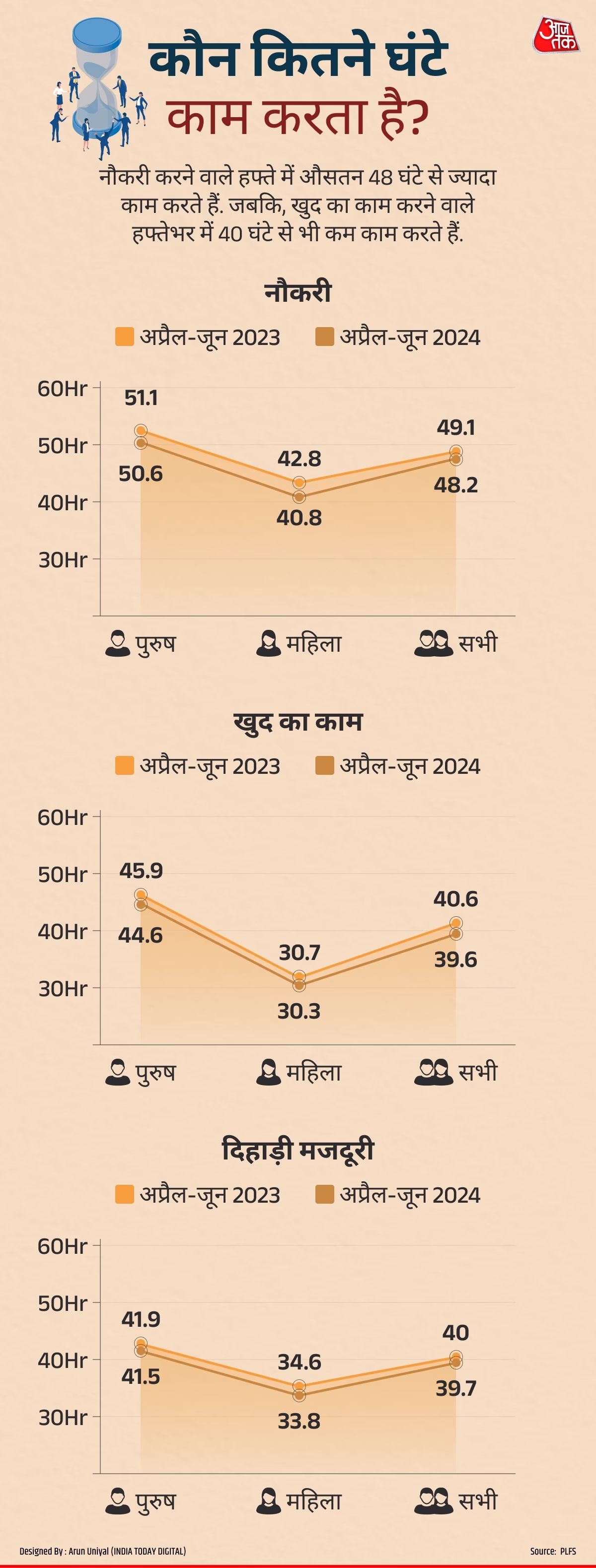 The survey indicates that employed individuals in the country work an average of 48.2 hours per week, earning a monthly average of ₹21,103. The positive aspect is that compared to the previous year, working hours have slightly decreased while earnings have increased. A year ago, individuals worked 49.1 hours weekly and earned ₹20,039 monthly. This means they are now working one hour less per week and seeing a 5% increase in earnings.